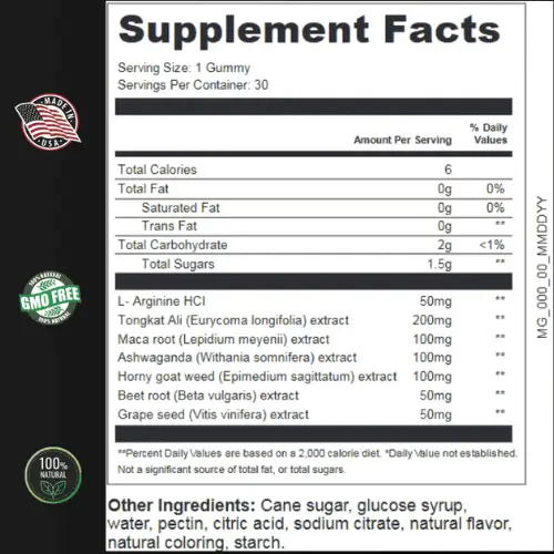 The great strength of this formula lies in the synergy of its components, which blend the wisdom of traditional ingredients like Ginseng and Maca Root with the effectiveness of nutrients validated by modern science. Each gummy is produced in the USA in FDA-registered and GMP-certified (Good Manufacturing Practices) facilities, ensuring a pure, safe product free from artificial stimulants or harmful additives. It’s the assurance you need to take care of your well-being.